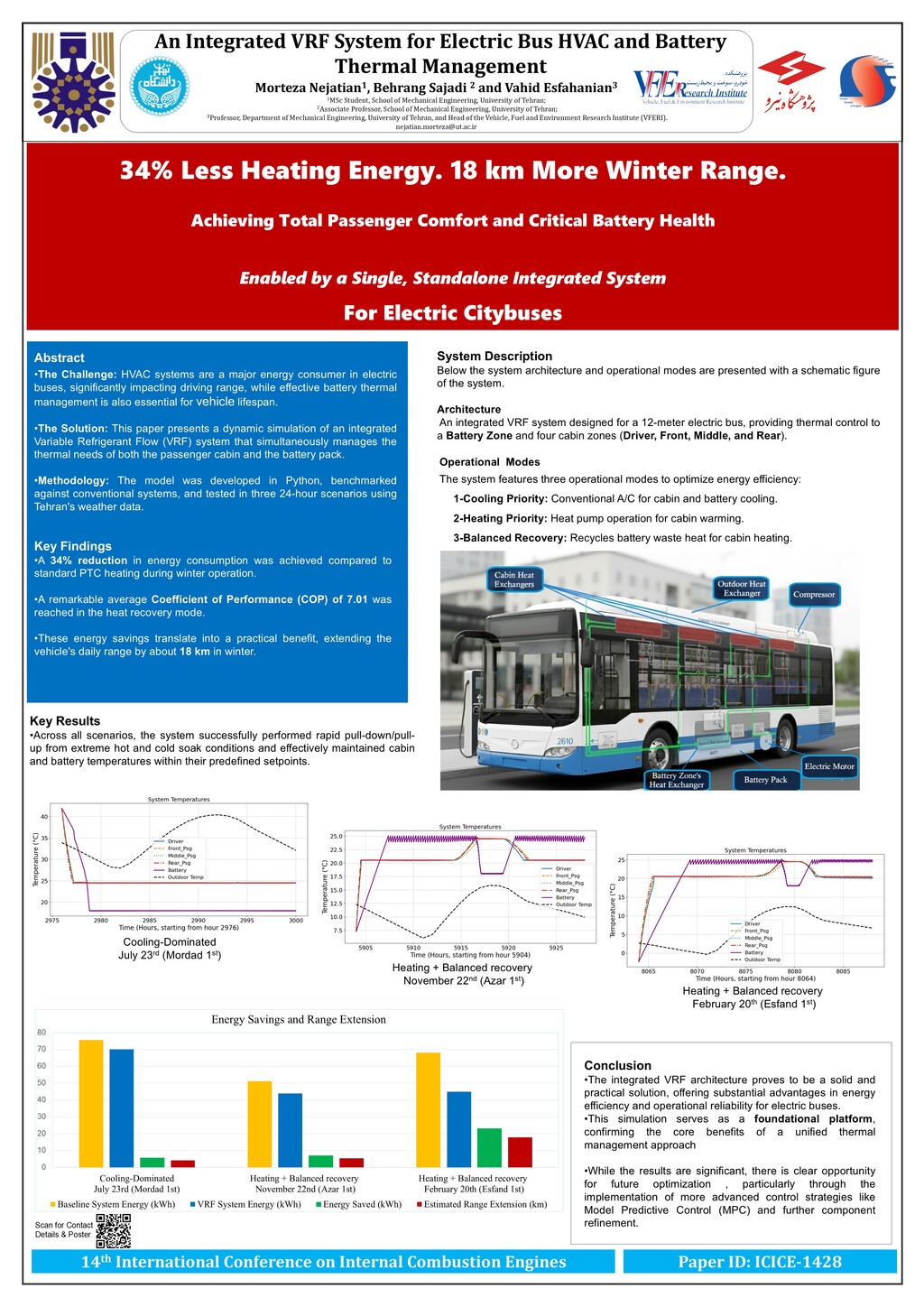 Heating, Ventilation, and Air Conditioning (HVAC) systems are a major contributor to energy consumption in electric buses, substantially affecting their driving range, especially under extreme weather conditions. Effective thermal management of the battery is also essential to prolong battery lifespan in electric vehicles. This paper presents a dynamic simulation of an integrated Variable Refrigerant Flow (VRF) system that simultaneously manages the thermal needs of both the passenger cabin and the battery pack. Developed in Python using the "CoolProp" library, the model is benchmarked against conventional air conditioning and Positive Temperature Coefficient (PTC) heating systems. Weather data from the "Meteonorm" library for Tehran’s summer, winter, and autumn conditions are used in three 24-hour scenarios. Results show significant efficiency improvements, with the VRF system reducing energy consumption by 34% compared to PTC heating during winter heating demand, while continuously managing battery thermal regulation. Moreover, in balanced conditions requiring simultaneous cabin heating and battery cooling, the system’s heat recovery mode achieved a notable average Coefficient of Performance (COP) of 7.01. These energy savings translate into practical benefits, extending the vehicle’s daily range by about 18 km during winter.
